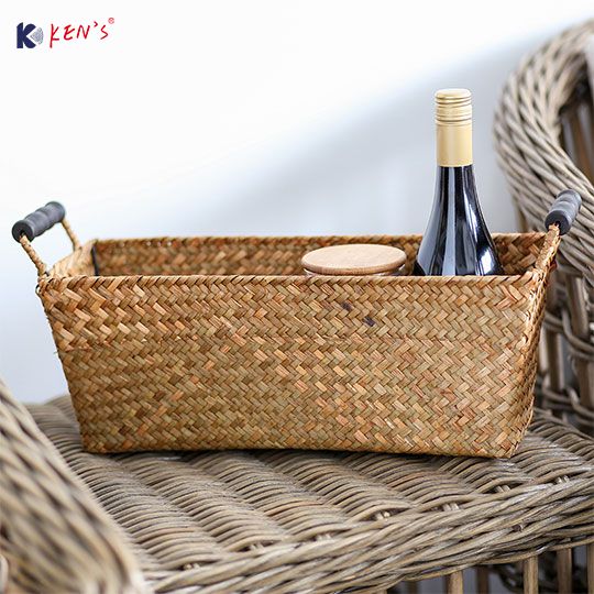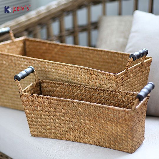 Flat seagrass basket with wooden handle S/4 (2532)