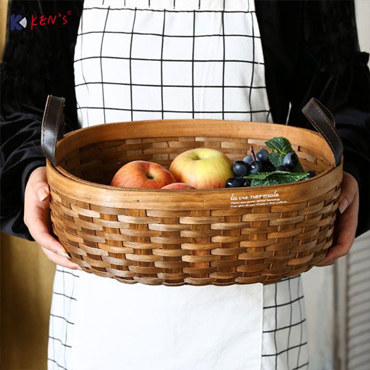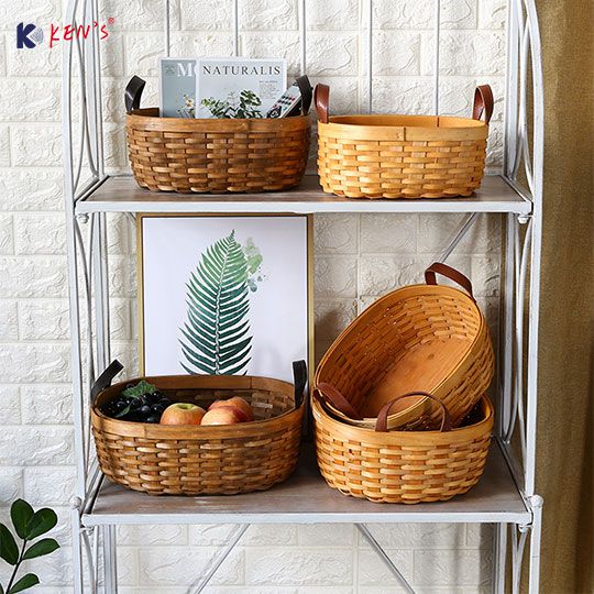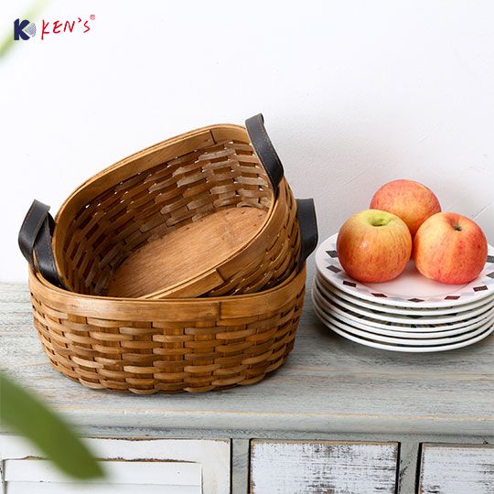 Wooden chips basket with leather handle S/3 (2428)
